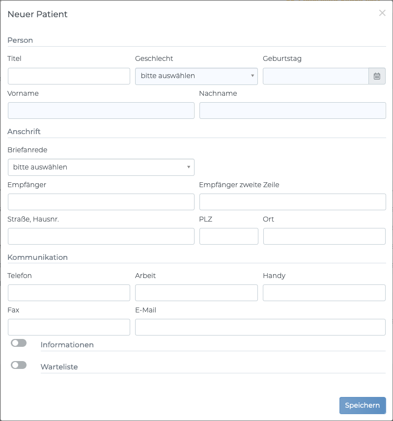 Neuer Patientin der AnsichtPatienten> Liste.Über die Schaltfläche